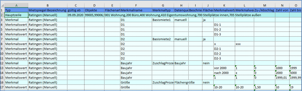 | Es wurde ein neuer Merkmalswert für die Basismiete hinzugefügt. | Es werden neue Zeilen für den neuen Merkmalswert angelegt. Die bereits erfassten Daten für die anderen Merkmale bleiben erhalten. |