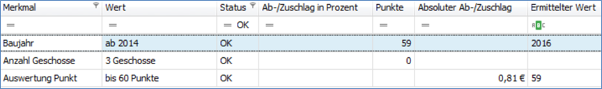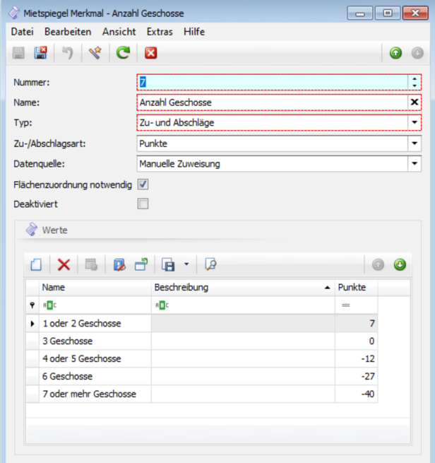 In einem Mietspiegel wird für das Baujahr und für die Anzahl der Geschosse eines Gebäudes jeweils ein Punktwert vergeben. Anhand der Summierung dieser Punkte ergeben sich dann absolute Aufschläge pro Quadratmeter. In iX-Haus werden dafür zwei Merkmale erfasst:
