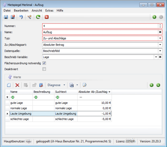 Element für Basismiete | Die Basismiete kann aktuell von bis zu sechs Elementen abhängen. Jedes Element braucht dabei eine eindeutige Nummer. Beim Anlegen eines neuen Mietspiegels wird das Feld automatisch vorbelegt. Sobald das erste Element vom Typ Zu- und Abschläge angelegt wurde, ist dieser Automatismus nicht mehr aktiv. |