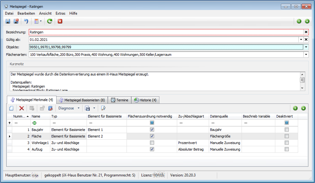 Sobald eine Objektnummer in einem neuen Mietspiegel in iX-Haus plus eingetragen wurde, werden die nachfolgenden Programmteile nur die Daten aus dem neuen Mietspiegel benutzen. Wenn der vorherige Mietspiegel aus iX-Haus gelten soll, muss das entsprechende Objekt im Mietspiegel iX-Haus plus ausgetragen werden.