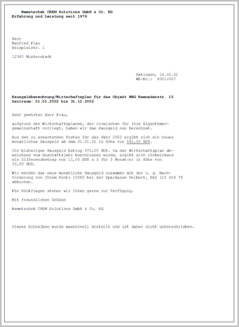 Musteranschreiben, welches mit der iX-Haus Texterfassung erstellt wurde. Dargestellt wird hier die Textvorlage
