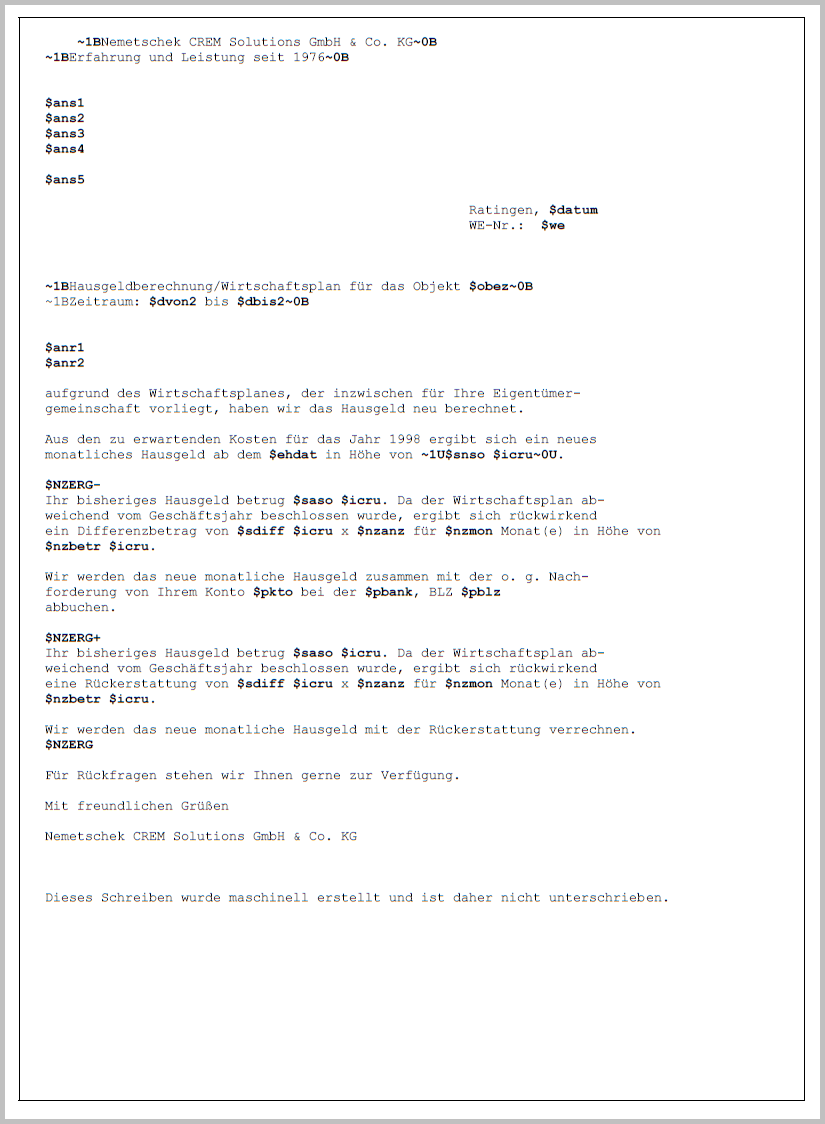 $NZERG0 | nachfolgender Text wird gedruckt, wenn die Summe der Sollbeträge im Vergleich zur letzten Abrechnungsperiode gleich geblieben ist. Hinweis: Das letzte Zeichen dieses Platzhalters ist die Ziffer Null (0) und nicht der Buchstabe (o)! |