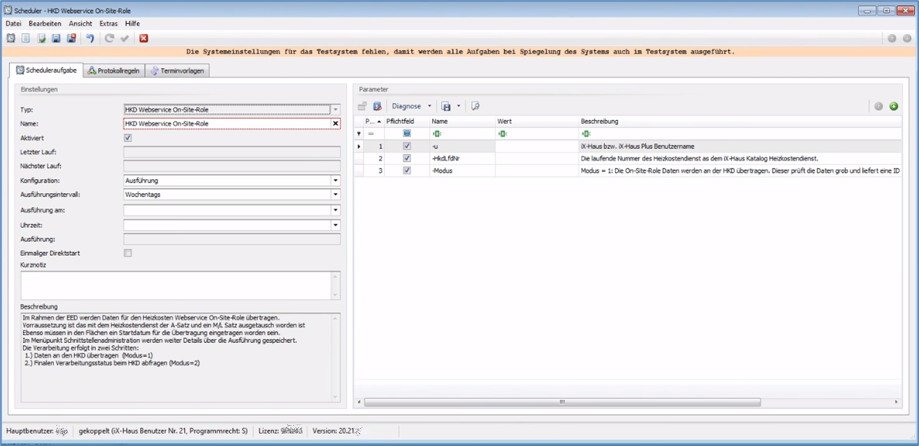 Neben den Daten zur Ausführungsfrequenz und der zeitlichen Steuerung sind unter den Parametern der Benutzer aus iX-Haus sowie die laufende Nummer des Heizkostendienstes aus dem Katalog der Heizkostendienste in iX-Haus zu erfassen. Über den Modus lässt sich steuern, ob die Aufgabe Daten überträgt oder den Status abfragt. Weitere Informationen zum iX-Scheduler entnehmen Sie bitte der zugehörigen Dokumentation im iX-Wiki.