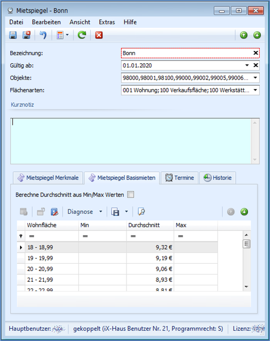 Damit müssen beim Erfassen der Basismiete immer alle drei Werte eingegeben werden. Das Ergebnis wird als Durchschnittsmiete ausgegeben.
