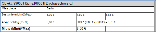 Die ermittelten Mieten aus dem Mietspiegel für eine Fläche entsprechen den Sollbeträgen, die im Flächenstamm für eine Fläche anlegt werden können.