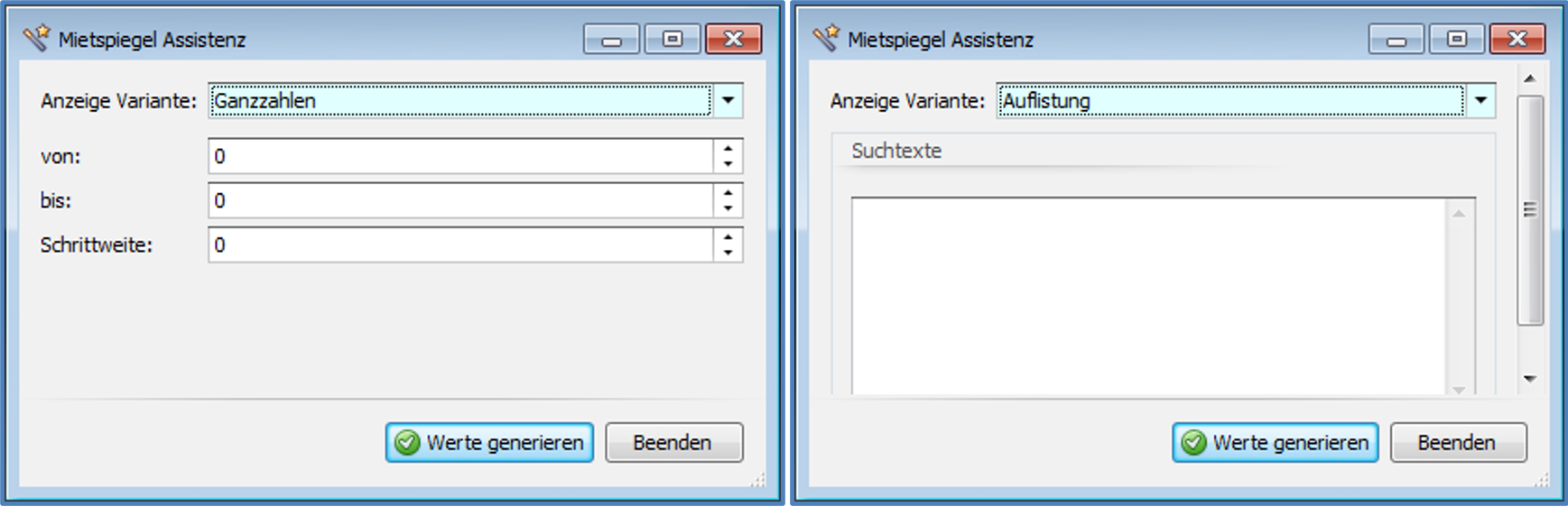 Um das Anlegen der Merkmalswerte zu erleichtern, existiert ein Assistent, der aus der übergeordneten Tabelle aufgerufen werden kann. Abhängig vom Datentyp können mit dem Assistenten unterschiedliche Intervalle für die Daten generiert werden.