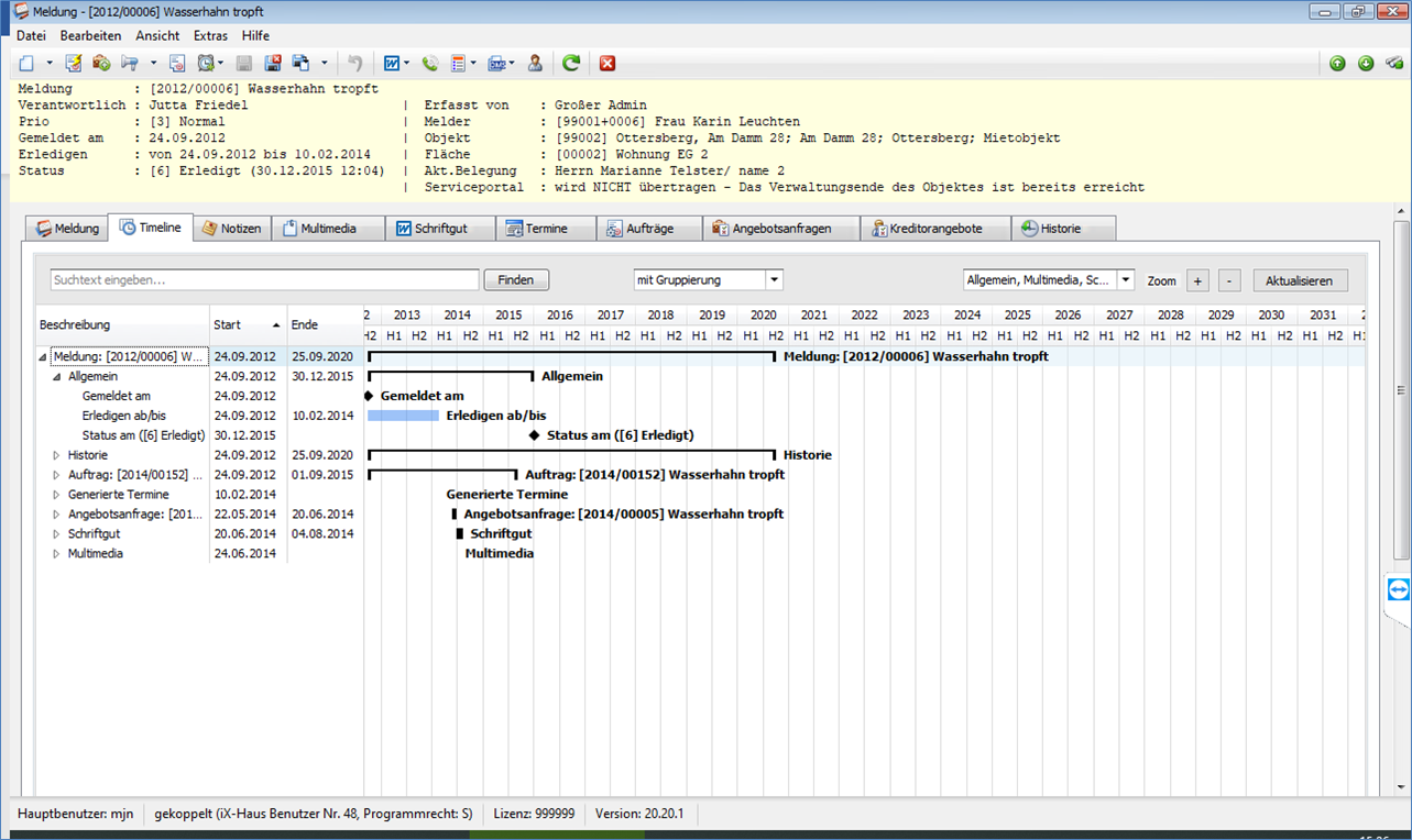 Aktuell für die Module Meldungen, Aufträge, TO, Serviceverträge und Projektverwaltung werden im Register Timeline die verschiedenen, für einen ausgewählten Datensatz erfassten Datumswerte zusammengeführt und graphisch dargestellt. Je nach Sortierung, Filterung und Anzeigevariante erhalten Sie so einen schnellen Überblick über die für Sie interessanten zeitlichen Abläufe z. B. einer Meldung, eines Auftrages etc.