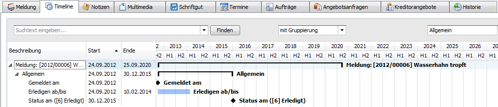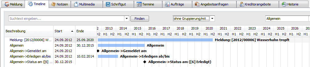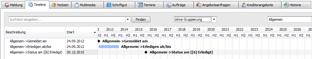 ACHTUNG: Die Klammer zum Beispiel bei der Gruppe „Meldung“ in Abb. 1 stellt nicht das Start-/Enddatum z. B. dieser Meldung dar, sondern den ersten und letzten aller zugeordneten Datumswerte! Wenn die Gruppe „Allgemein“ betrachtet wird, existiert dort das Start-/Enddatum. Bei dem langen Balken für die Historie ist z. B. zu erkennen, dass hier lange nach dem Ende der Meldung noch Daten verändert worden sind.