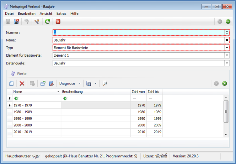 Element für Basismiete | Die Basismiete kann aktuell von bis zu sechs Elementen abhängen. Jedes Element braucht dabei eine eindeutige Nummer. Beim Anlegen eines neuen Mietspiegels wird das Feld automatisch vorbelegt. Sobald das erste Element vom Typ Zu- und Abschläge angelegt wurde, ist dieser Automatismus nicht mehr aktiv. |