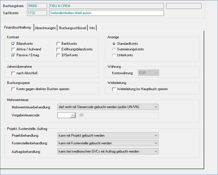 Um die Buchhaltung und den Zahlungsverkehr anzubinden, ist es erforderlich, ein Sachkonto als Sammelkonto für die Verbindlichkeiten aus Mietkautionen anzulegen, eine spezielle Sollart für Kautionen zu definieren, die E-Banking Regeln zu erweitern und die Bankverbindung für die Kautionen in den Objektparametern zu hinterlegen.