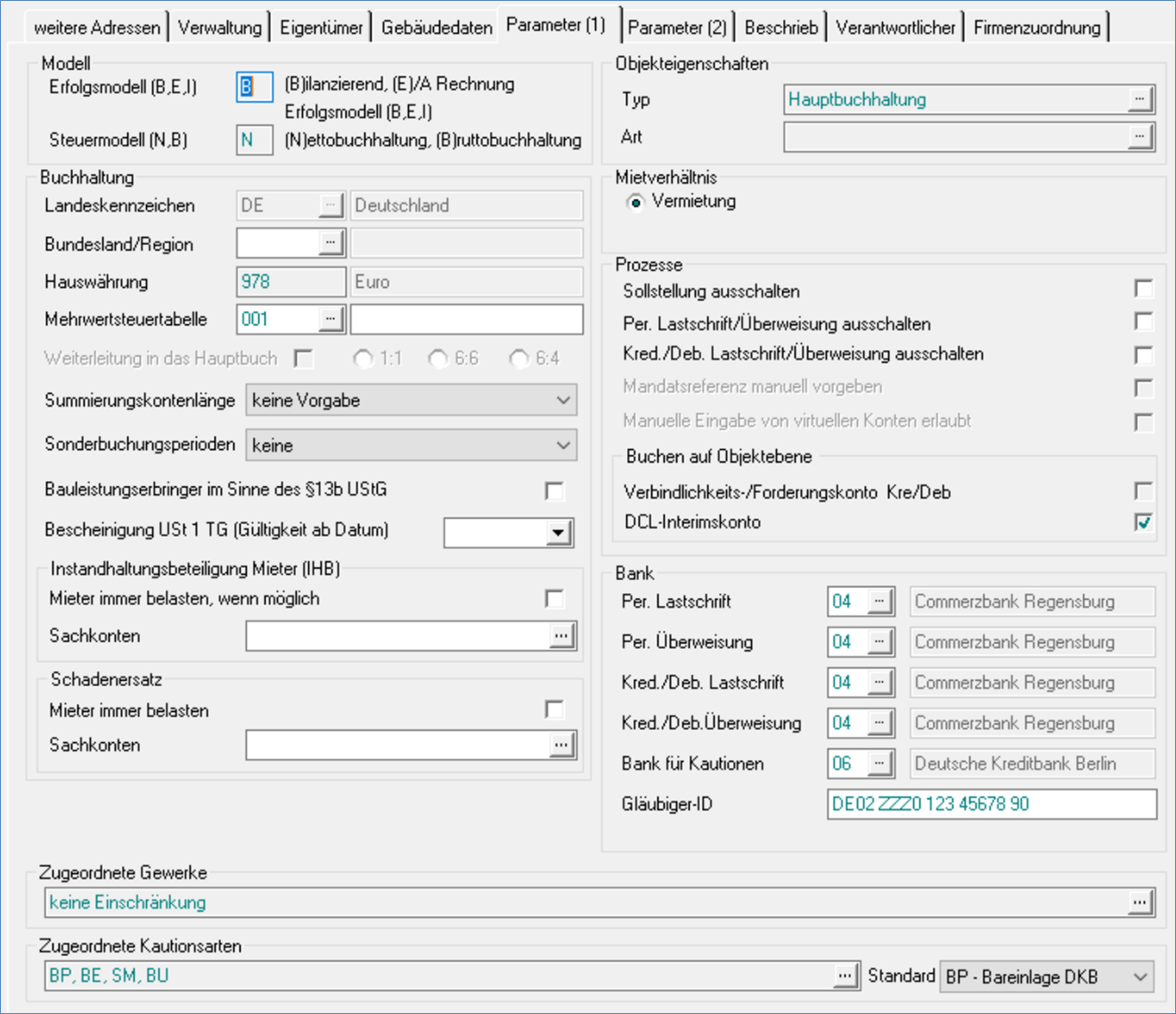 Für den Zahlungsverkehr im Rahmen der Kautionsverwaltung wird die Bankverbindung des Kautionskontos (Treuhandsammelkonto) im Bankenstamm hinterlegt und in den Objektparametern (1) zugeordnet.