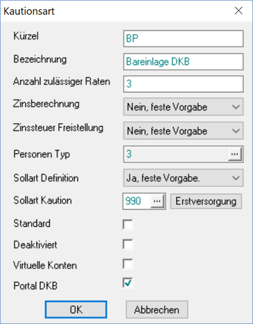 Zudem werden spezielle Sollarten / Personenkonten für Kautionen benötigt, um den Auszahlungsprozess von Kautionen aus iX-Haus zu initiieren. Eine Sollart wird in einer eigens dafür vorgesehenen Kautionsart „Kautionen DKB“ zugeordnet.